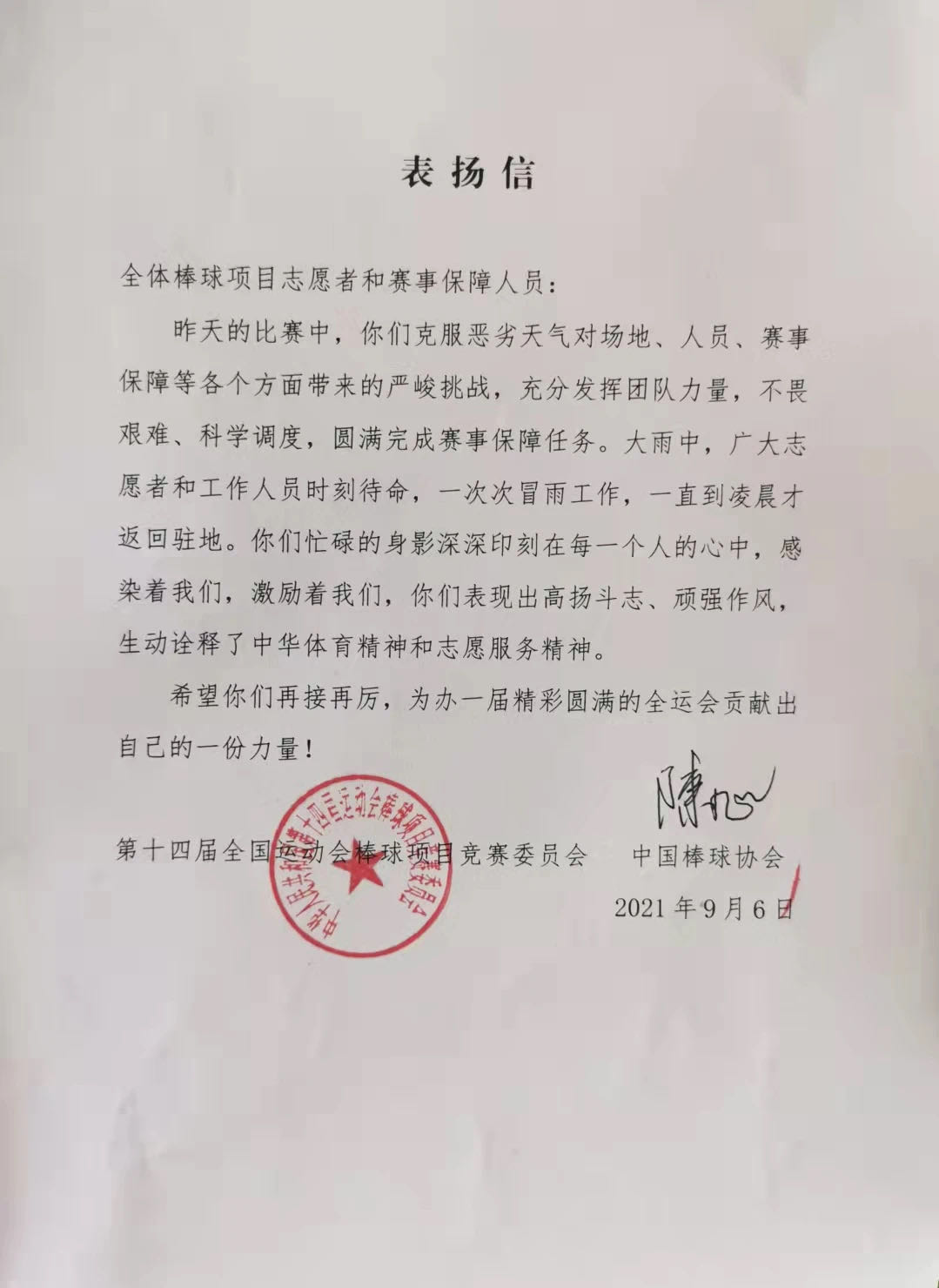 中国棒球协会在9月6日发来的表扬信中提到,9月5日的棒球比赛在大雨天气下一直持续至晚上22:40,志愿者们及工作人员充分发挥团队力量,不畏艰难,科学调度,冒雨工作,及时用海绵吸取场地的积水,直至凌晨才返回驻地,圆满完成了赛事保障工作。表扬信指出: