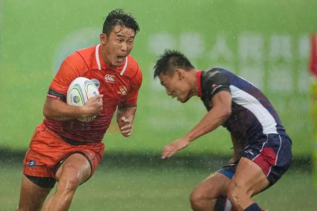 ↑天津队球员阿尔达克·木合亚提在比赛中达阵得分。