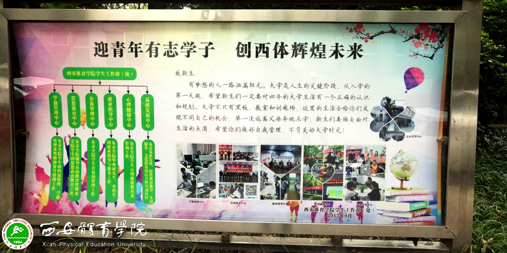 本网讯 新学期,新气象,新面貌。校园宣传栏是校园文化建设的重要载体,是展示学校品牌形象的重要窗口,亦是系部各处室相互交流学习展示的平台。为迎接新学期开始和新生入学,努力营造良好的校园文化氛围,由宣传部倡议,各系部、各部门将宣传栏更换一新,直观展现了近期在教学、科研、竞赛、训练及在特色亮点工作等方面取得的成绩,吸引着许多过往的师生、家长驻足观看,促使并引导新生朋友尽快了解西体、热爱西体、增强归属感,成为校园里的一道靓丽的风景线。9月3日,记者抓拍一组比较有特色的宣传栏,供大家欣赏。