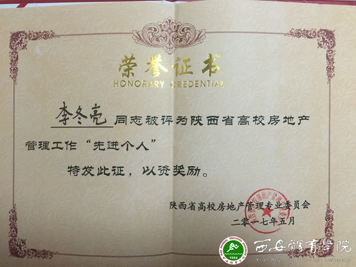 我院国有资产管理处李冬亮同志被陕西省高校房地产管理专业委员会授予“先进个人”荣誉称号