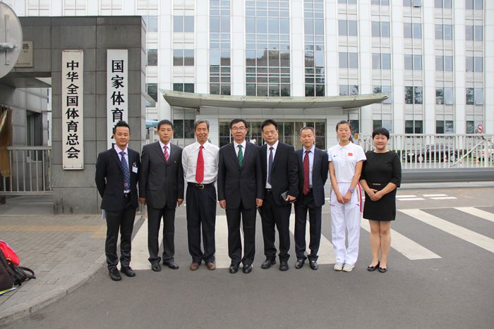朱元利副书记(右四)、雷甲谋部长(右三)、李大华同志(右二)、高卫同志(左三)、索文涛同志(左二)、运动员王杨(左一)