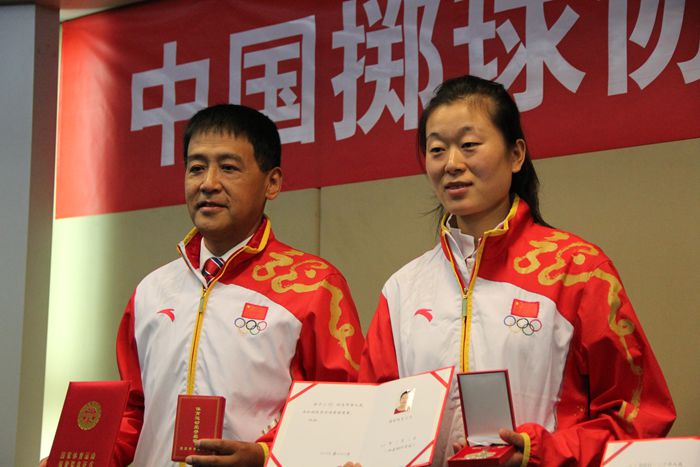 会上,索文涛代表我院做了《风雨历程三十载》的交流发言,简要介绍了我院掷球开展三十年的成长历程,我院对地掷球发展做出的重要贡献受到与会代表的高度赞扬。颁奖环节中,中国掷球协会主席施泽华为我院高卫教授和运动系2012级学生王杨等四人颁发了优秀教练员和运动员荣誉奖章及证书。