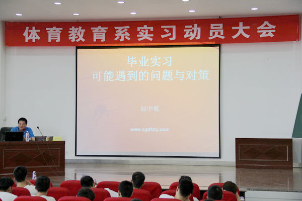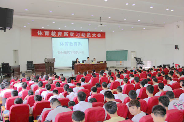 本网讯 5月27日下午,体育教育系2016届实习动员大会在新教学楼5楼报告厅举行。体育教育系主任周家颖、系党总支书记屈崇斌、系办公室主任李倩、2012级年级主任马红娟、辅导员郭运涛、2011级年级主任王深宏、辅导员岳志铁、特殊教育专业兼职辅导员朱彬及担任本届实习指导的王澍、冯宝元等12位教师与体育教育专业和特殊教育专业全体同学共同参加了此次会议。