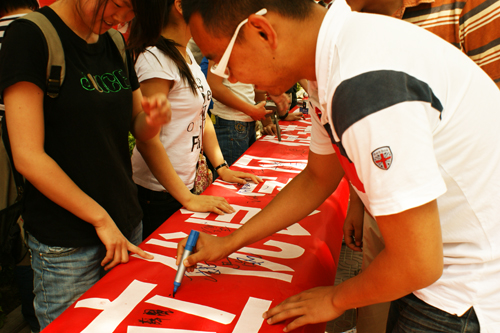 在纪念五四运动90周年、建团87周年之际,院团委、院学生会在学生区举办了以“弘扬五四精神、实践科学发展、树立优良学风、促进全面发展”为主题的签名活动。活动当日,近600名学生在长幅上庄重的签上自己的姓名。