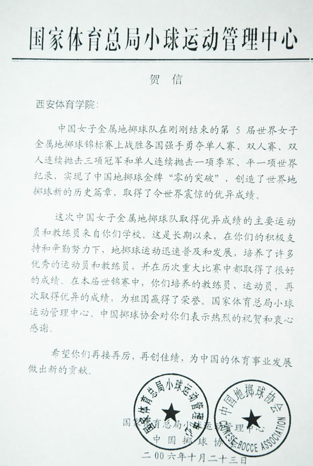 国家体育总局小球运动管理中心贺信