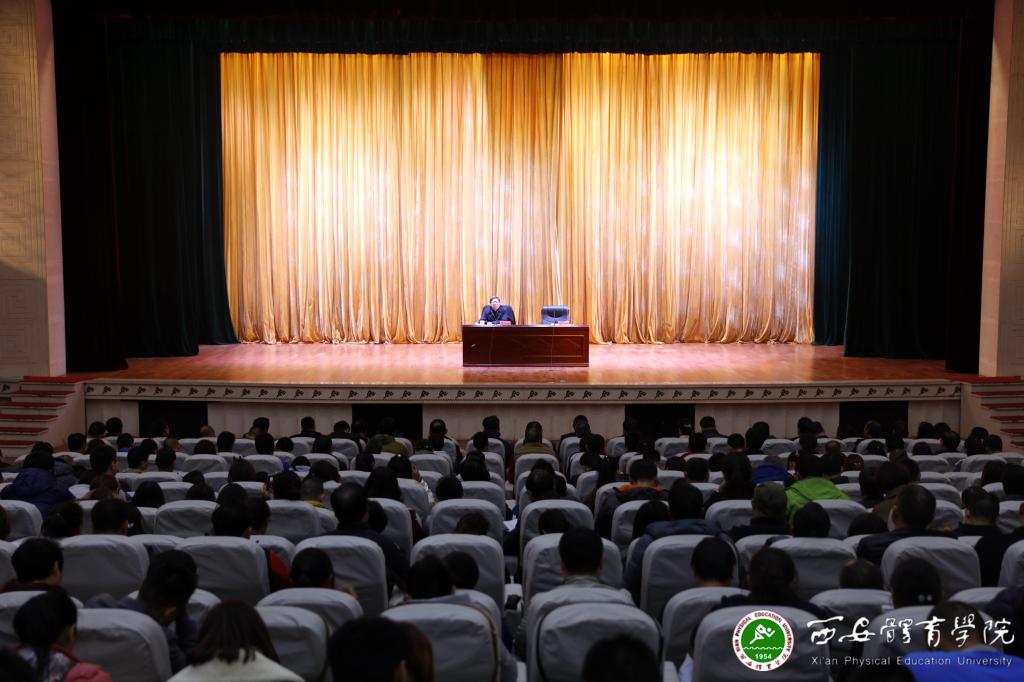 本网讯 11月22日下午,陕西省委宣讲团成员、省政府研究室主任杨三省教授应邀到我院艺术馆大礼堂,向全省体育系统的党员干部、我院师生代表1000余人作党的十九大精神宣讲报告。省体育局党组书记、局长姚金荣,省体育局副局长邹军,我院副院长文立新,我院纪委书记赵军等领导参加了学习,报告会由姚金荣主持。