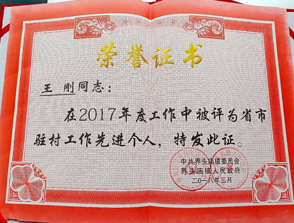 王刚被评为省市驻村工作先进个人