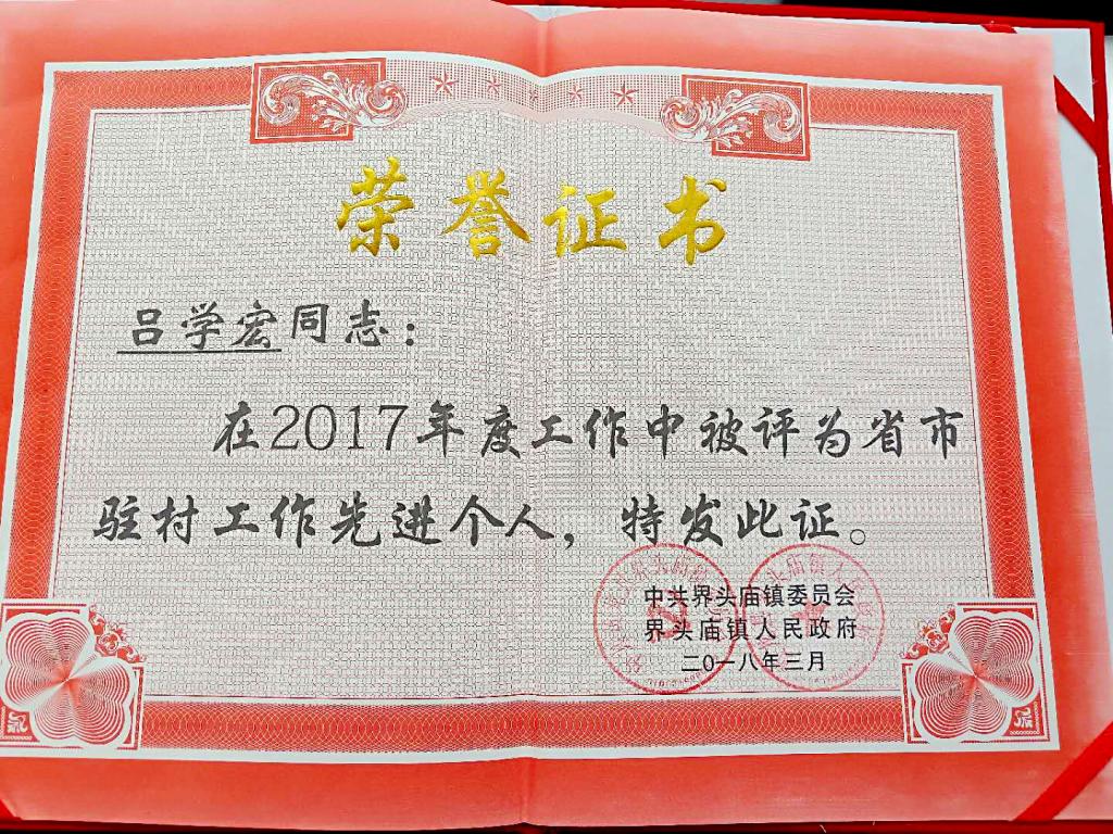 2018年初,吕学宏、王刚同志被评为《界头庙镇2017年度省市驻村工作先进个人》。正是通过他们扎实的工作,赢得了群众的信赖和支持,获得了一致好评,展现了西体人的风采。