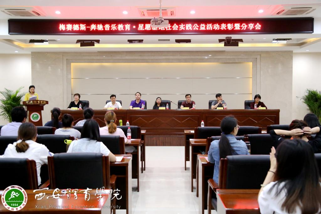本网讯 6月8日上午,“梅赛德斯——奔驰音乐教育·星愿基地”社会实践公益活动表彰暨分享会在我院2号办公综合楼六楼报告厅举行。团省委希望办主任、陕西青基会理事长乌钢,北京荷风艺术基金会艺术总监陈英子,北京荷风艺术基金会项目经理韩鹏,党委宣传部部长高月宏,学生处处长王志刚,体育艺术系党总支书记李美霞,院团委副书记熊辉,院团委副书记王红霞,体育艺术系音乐教研室主任张艳出席此次活动。