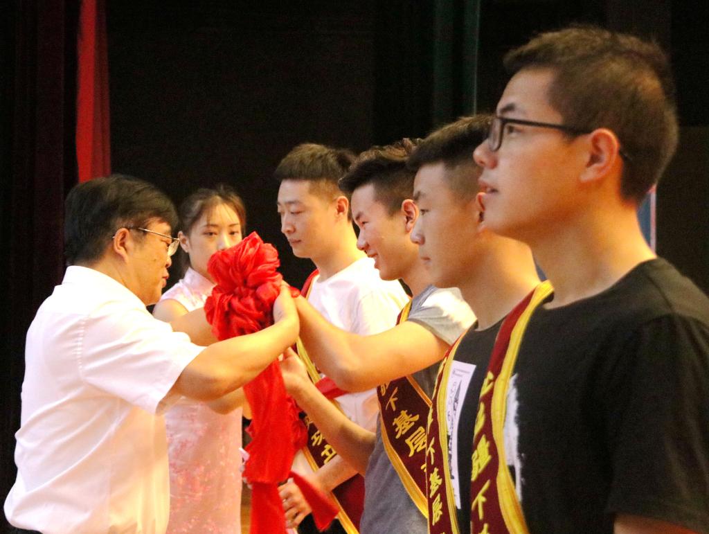党委书记黄道峻在2018届本科生毕业典礼上为陈小龙等四名毕业生佩戴大红花