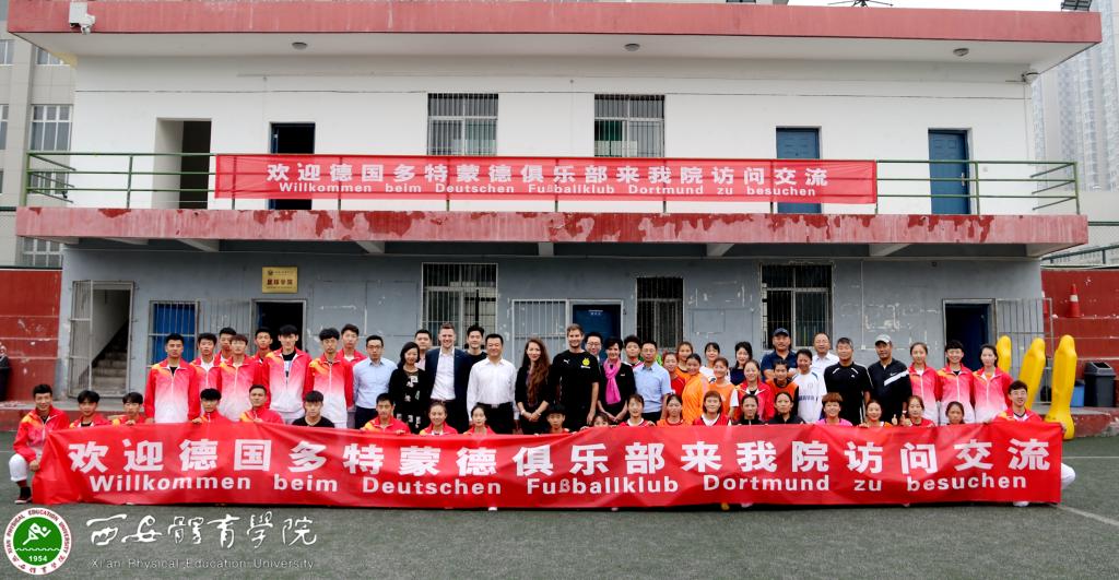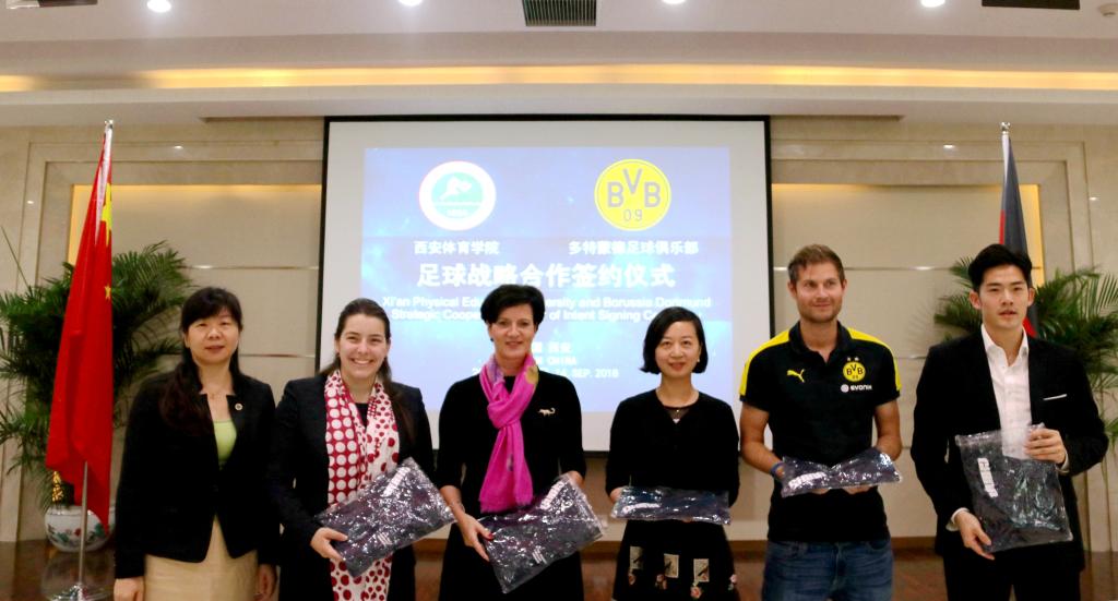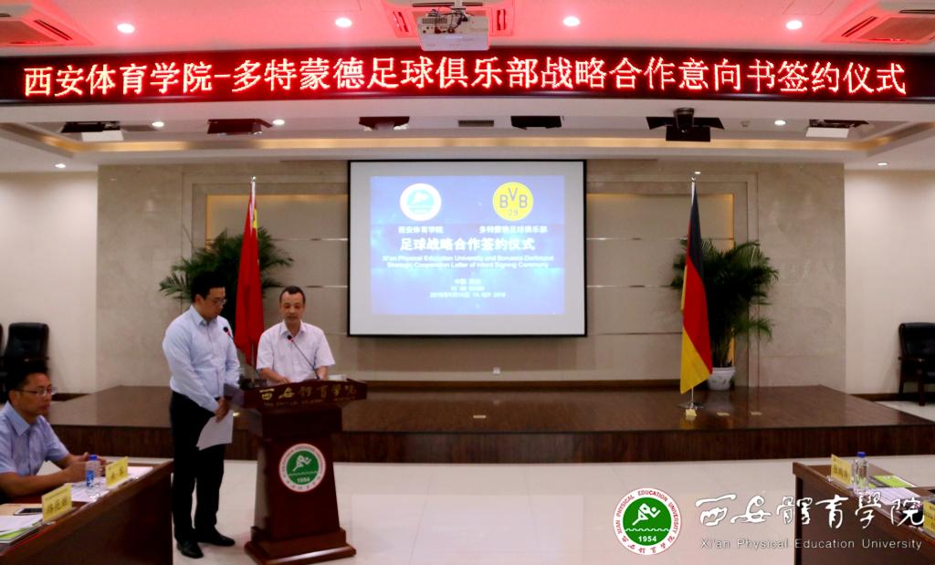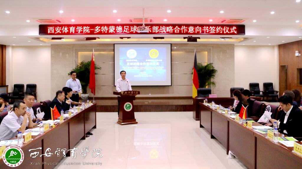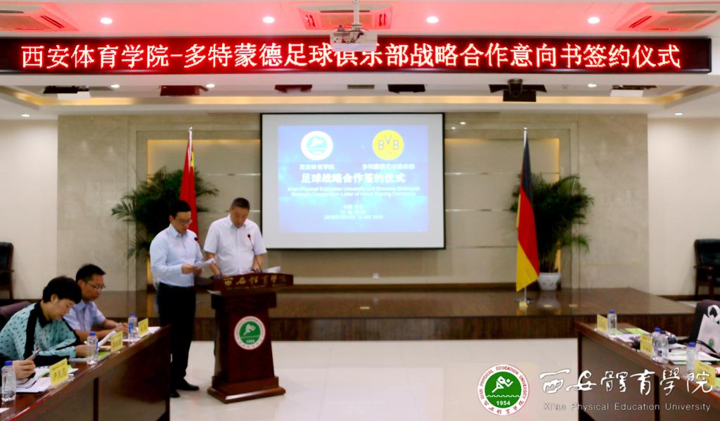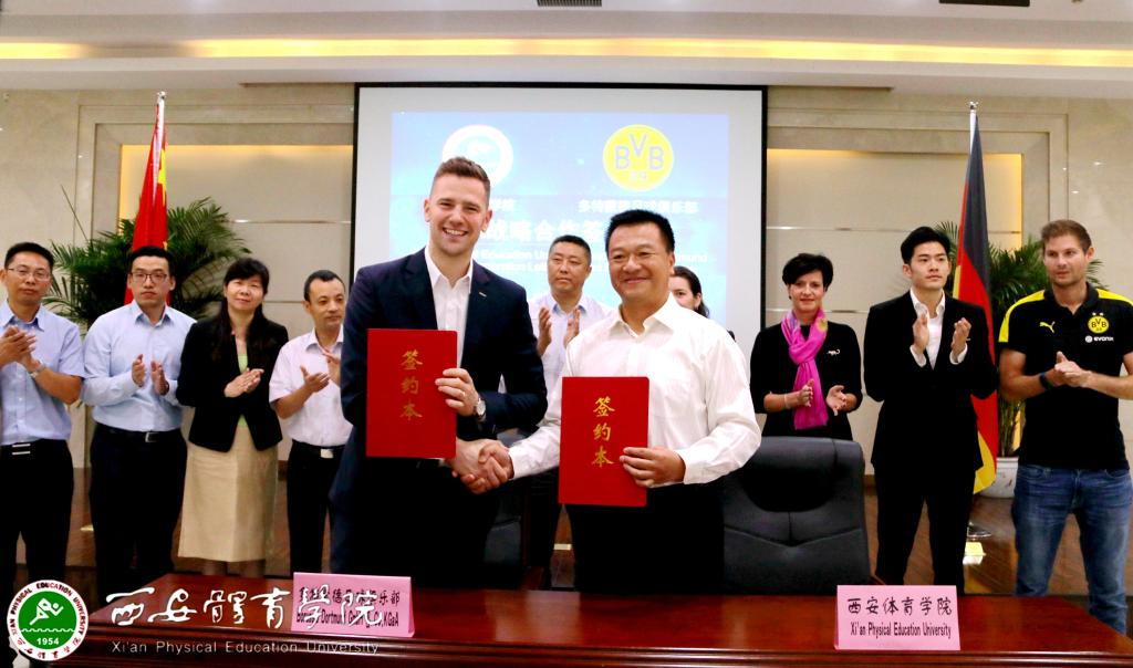 本网讯 9月14日上午,我院与德国多特蒙德足球俱乐部举行战略合作意向书签订仪式。德国多特蒙德俱乐部驻中国办事处大中华区总裁本杰明·瓦尔、德国驻华大使馆(北京)文化处副主任米星辰以及德国商会代表一行9人参加,陕西省体育局副局长邹军、陕西省教育厅体卫艺处副处长李梁、陕西省体育局竞体处副处长路花丽,我院院长朱元利、副院长陈彦、纪委书记赵军、足球学院院长朱军、西安部分知名中学和足球俱乐部代表出席签约仪式。我院竞赛训练处处长张鹏华主持。