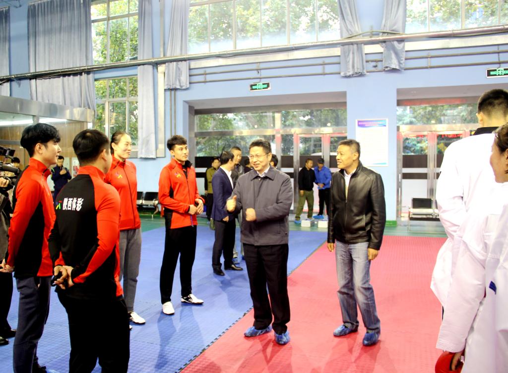 本网讯 2021年第十四届全国运动会将在我省举办,为全面了解全运会备战情况,11月6日下午,副省长方光华一行在省体育局局长王勇、副局长邹军以及竞体处处长陈波,省拳跆中心书记、我院竞技体育学校校长张文军的陪同下察看了跆拳道队和空手道队训练情况,亲切慰问了省拳跆中心和我院运动员、教练员,并听取了工作汇报。