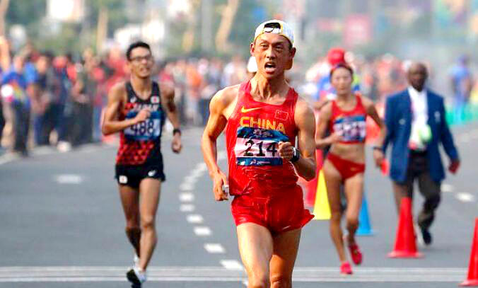 王凯华在第十八届亚运会上获男子20公里竞走金牌(图为比赛中)