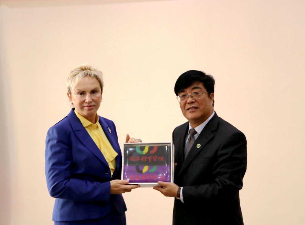 党委书记黄道峻向俄罗斯国立体育运动、青年与旅游大学Tamara Mikhaylova校长赠送纪念品