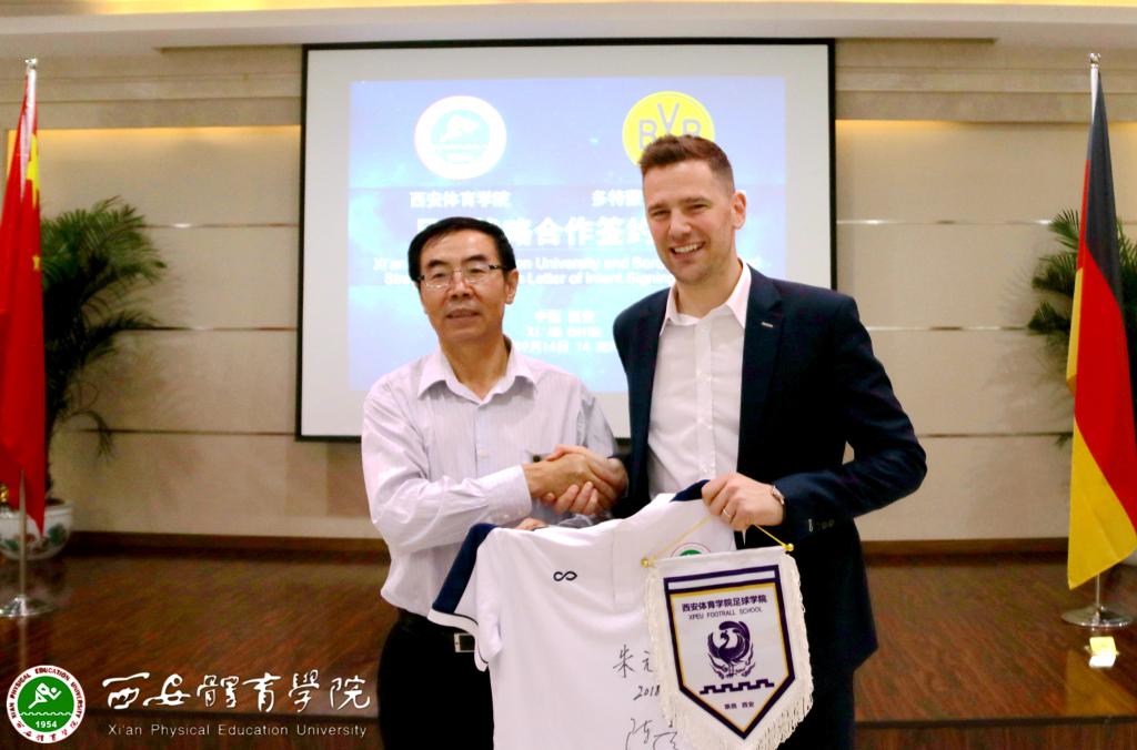 院长朱元利与德国多特蒙德足球俱乐部代表互赠纪念球衣