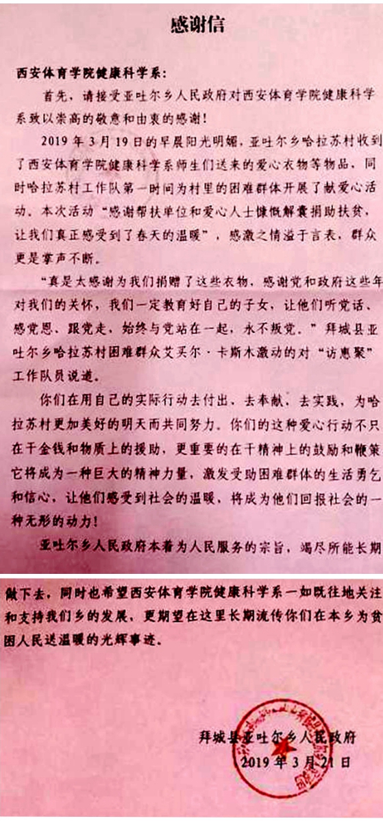 本网讯 三月是学雷锋月,健康科学系的“弘扬雷锋精神,传递爱心梦想——爱心捐献”公益活动受到了新疆维吾尔自治区阿克苏市拜城县亚吐尔乡人民政府、和田地区皮山县乔达乡人民政府的欢迎和肯定并寄来感谢信。