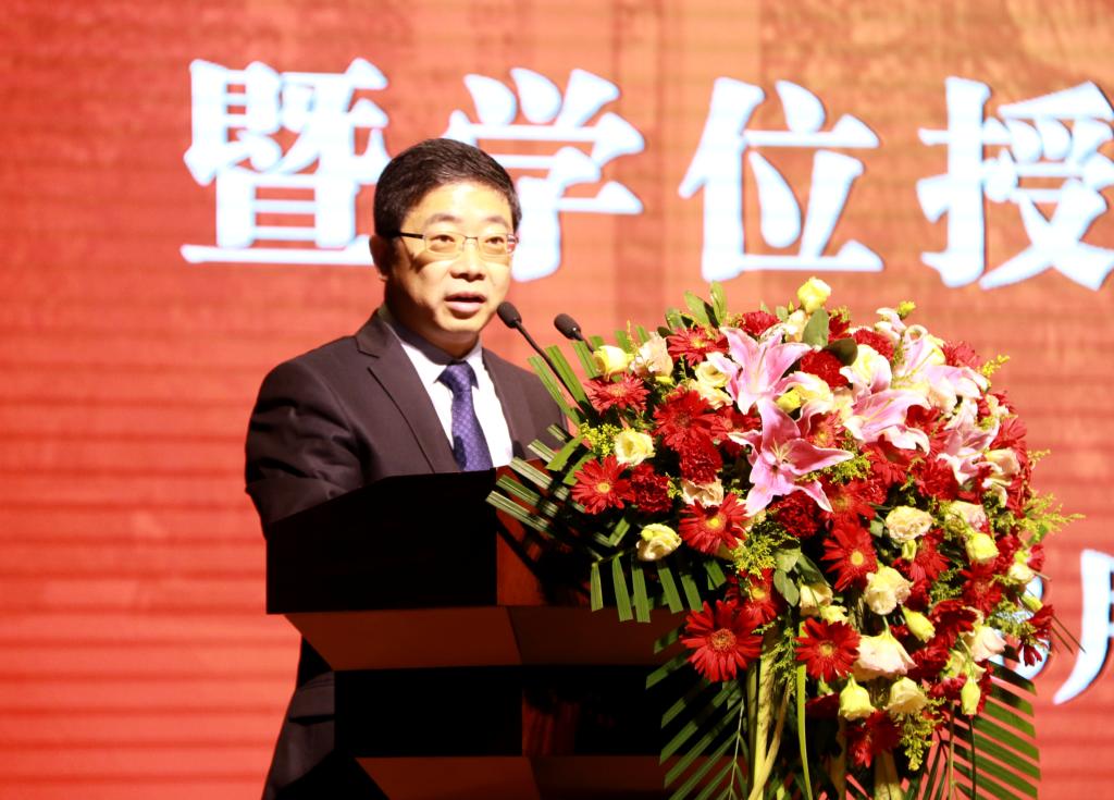 体育健康系刘涛教授作为教师代表发言,对全体毕业生即将踏上人生新旅程表达了诚挚的祝福:一是要有责任和担当,以天下为己任;二是要坚定理想和信念,在困境中保持尊严,以今天的努力赢得明天的希望;三是要充满爱心和情怀,懂得欣赏与感恩,海纳百川,展翅翱翔。