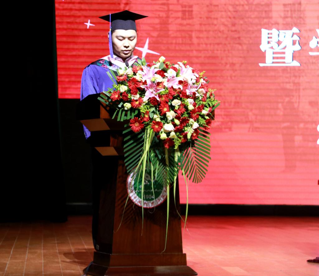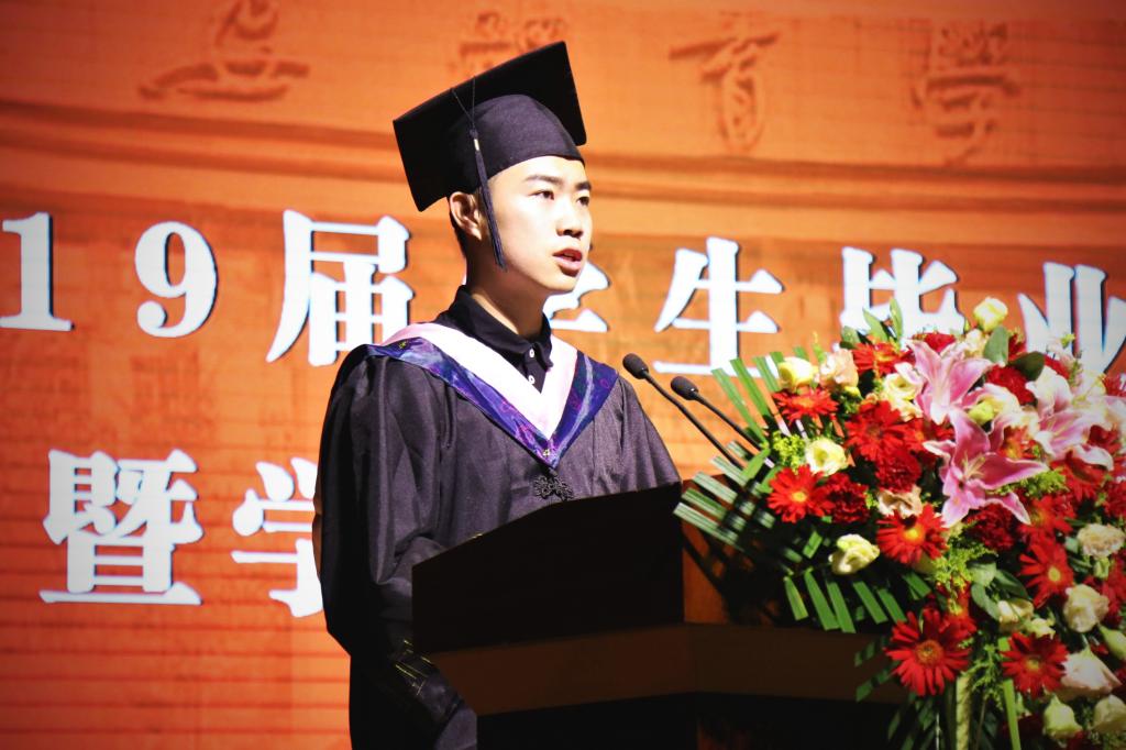 体育经济与体育管理系2015级王铖皓作为本科毕业生代表发言。他表达了自己对母校的感恩与不舍,“一入西体门,终生西体人!”表示要发扬西体精神,在各自人生的舞台上,砥砺前行,勇攀高峰,书写自己的成功与辉煌!