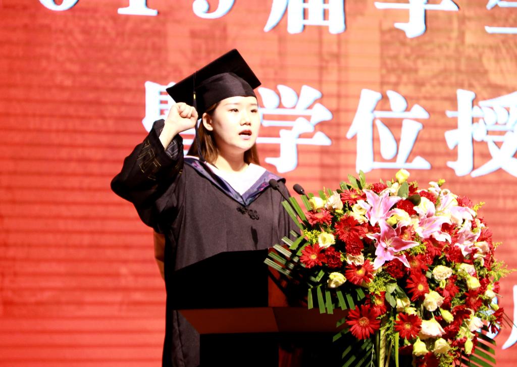 最后,2019届优秀毕业生代表、体育传媒系柴常潇带领全体毕业生进行庄严宣誓。