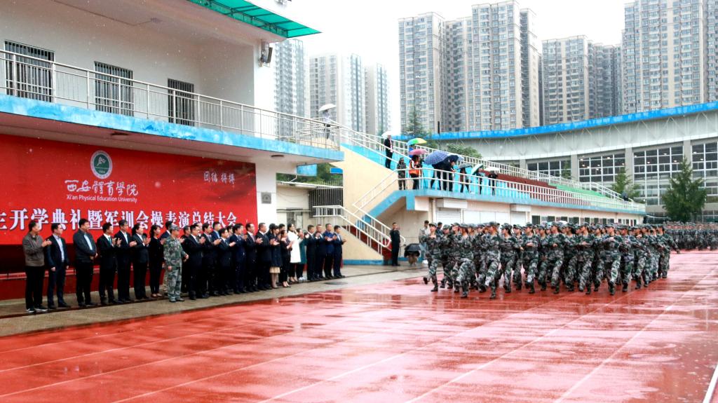 据悉,本次军训时间虽短,但训练科目复杂,既有单个军人队列动作训练,又有分列式表演;既有花样队列排练,又有刺杀操表演,还组织了“我爱唱军歌”歌咏比赛与应急消防演练等活动。在繁重的训练中,2019级西体新生服从管理、严守纪律,态度端正、虚心好学,团结协作、注重大局,不仅增强了身体素质,培养了生活自理能力,更磨练了意志品质,增强了国防意识,达到了军训的预期目的,也展现出了体育人吃苦耐劳、坚韧不拔、追求卓越、永攀高峰的精神风貌。大雨中的会操表演,为两周的军训画上了圆满的句号。