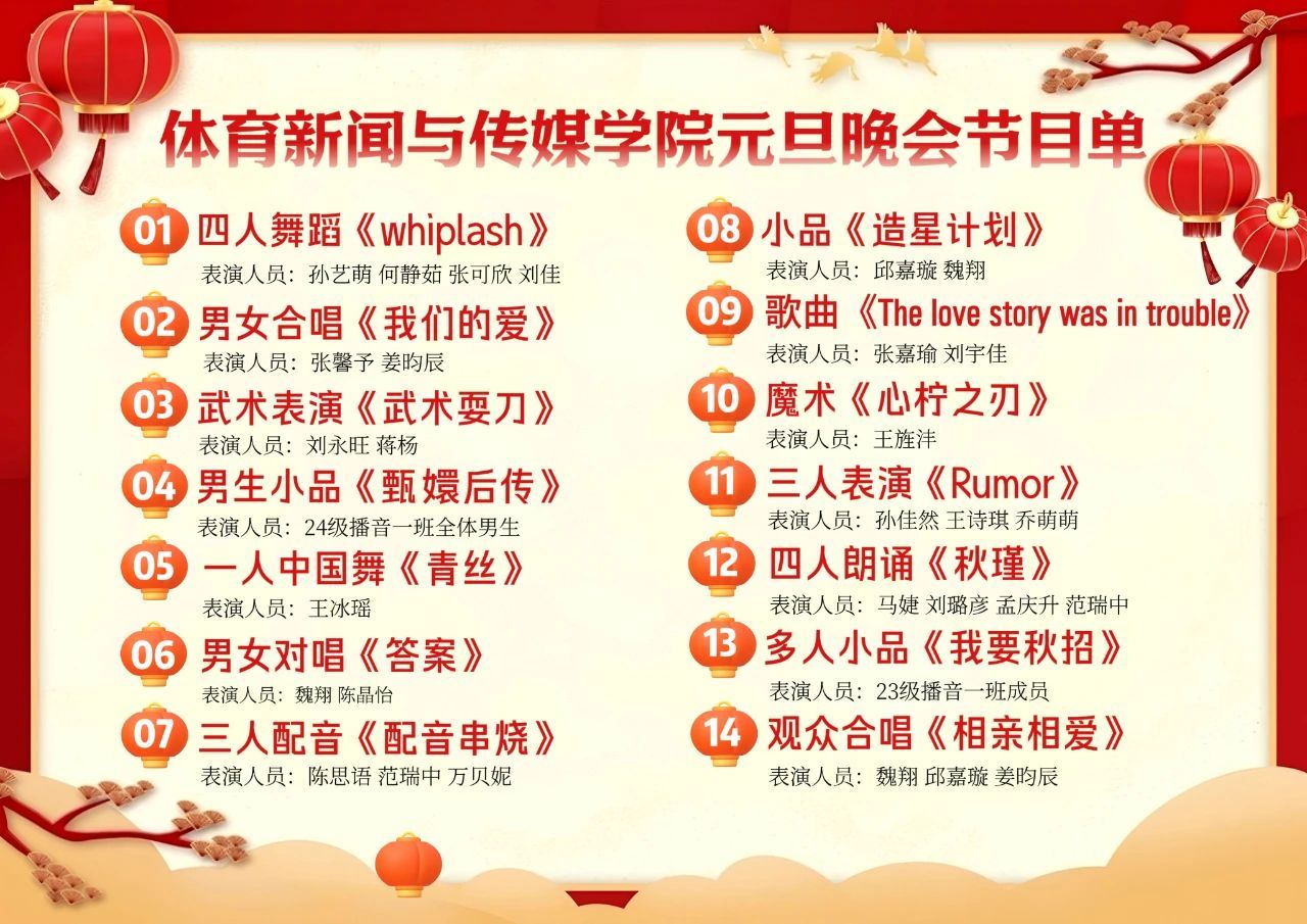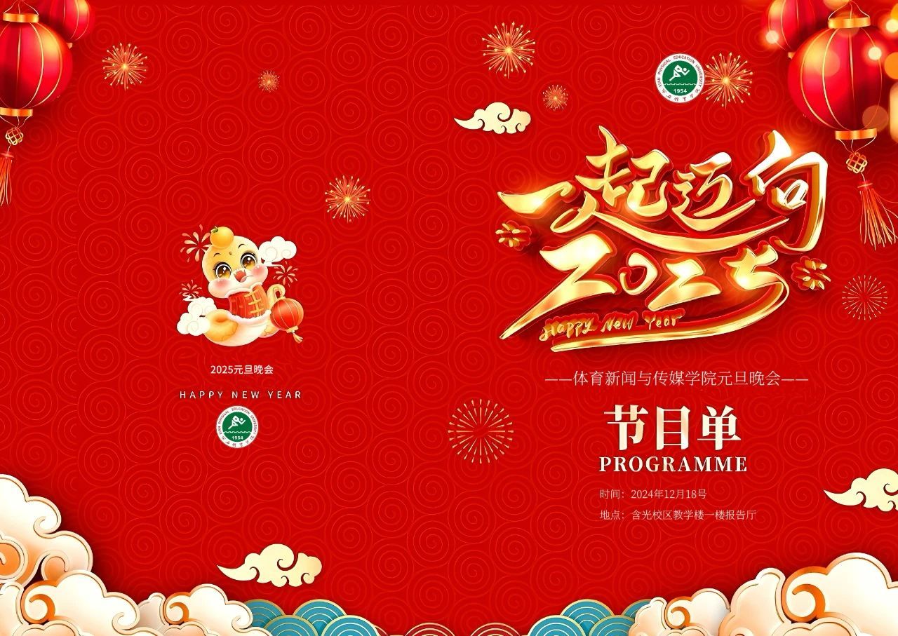 岁序更替,华章日新。当新年的钟声即将敲响,体育新闻与传媒学院精心筹备的元旦晚会也将拉开帷幕,这是一场视听交织的盛宴,更是一场青春与梦想碰撞的狂欢。在这里,我们将挥别过往,拥抱新岁;在这里,创意与才华交织,激情与梦想共燃。让我们相聚体育新闻与传媒学院元旦晚会,共赴一场璀璨夺目的新年之约,在欢声笑语与感动泪水中,迎接 2025 年的第一缕曙光,开启体育新闻与传媒学院新征程!